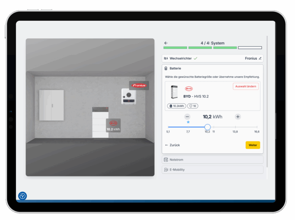 Sie gestalten jeden Aspekt des PV-Planers nach Ihren Wünschen: Intro-Screen, Farben, Logos, Produktauswahl und Kontaktformular. Alles in Ihrem Corporate Design, alles unter Ihrer Kontrolle.
